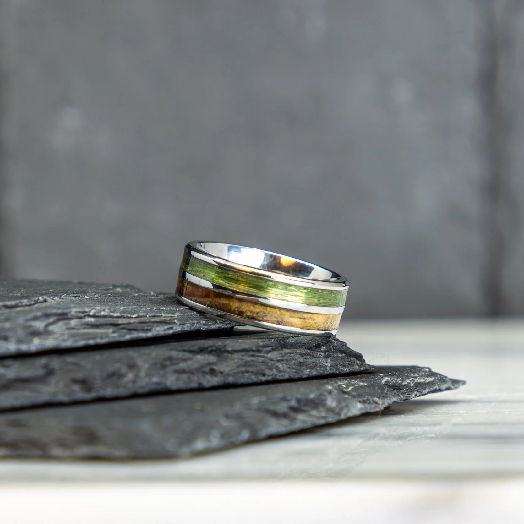 This client’s ring showcases materials from his late grandfather’s home. Fishing line found on an old fishing reel, and wood from the front doorway casting were mounted and sealed on dual-channeled tungsten.